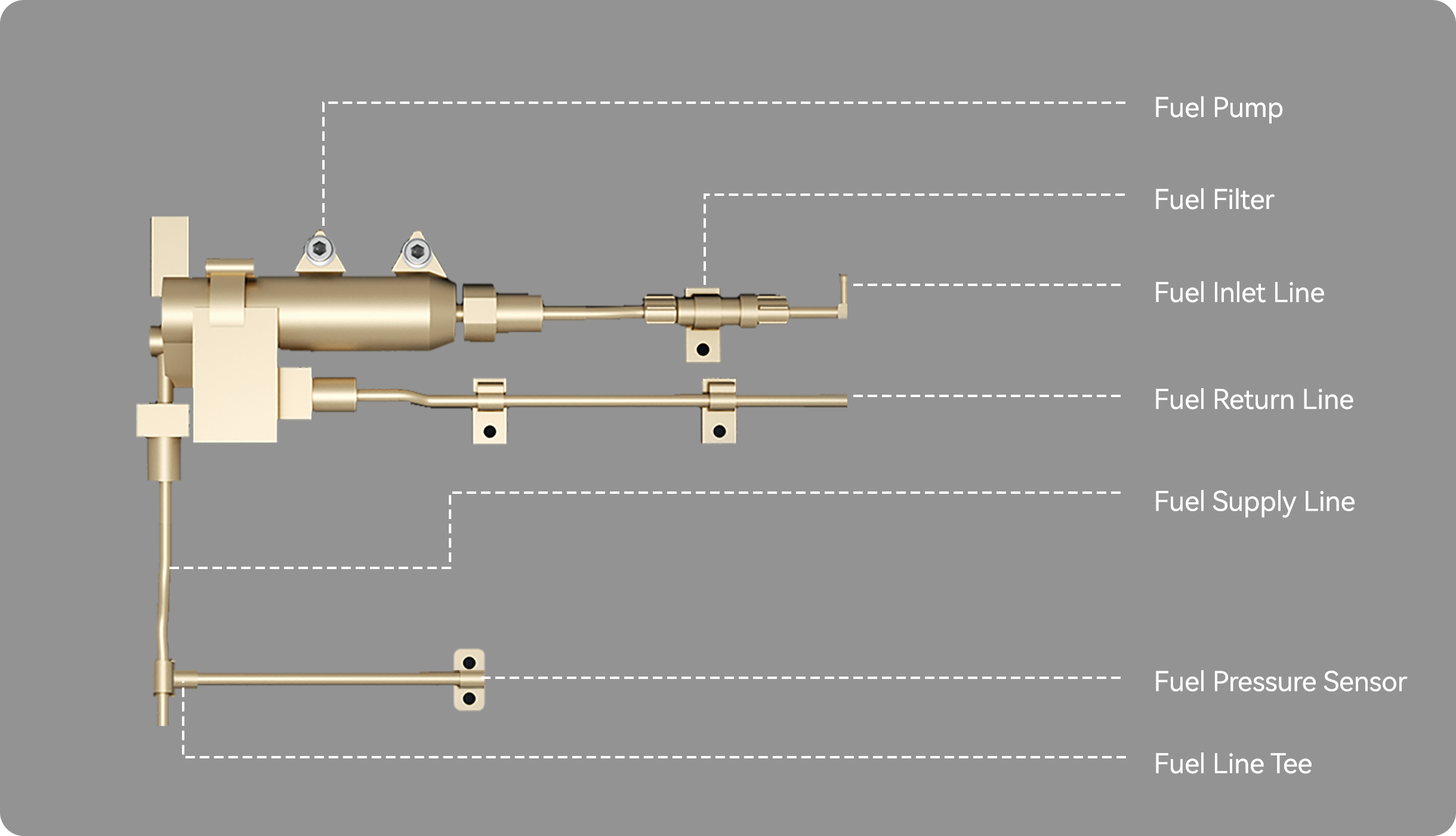 The fuel oil supply pipeline adopts integrated module design, which is easy to install and replace. A high-performance oil pump is used to ensure normal fuel supply, and a fuel pressure regulator is provided to ensure that the fuel pressure supplied to the engine meets the requirements. The oil circuit is equipped with a self-sealing quick-release joint to ensure that the fuel will not leak and is easy to replace and disassemble. The oil drain port is convenient and fast, with high reliability and not easy to operate incorrectly.