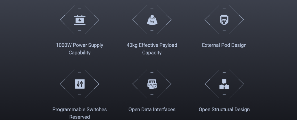 V1 supports third-party payload retrofit compatibility. The entire system is equipped with a 1000W power supply capacity and a maximum payload of 40kg. The external pod design allows for effective adaptation to various irregular payload installations. The flight platform also reserves programmable switches and multiple data interfaces to meet customer-specific customization needs.
